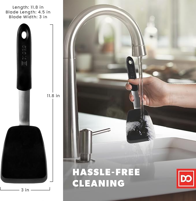 - HASSLE FREE CLEAN-UP – Your time is valuable, and that is why we have created a turner that is easy to clean by hand, dishwasher safe, and made without cracks or crevices to trap unwanted food and grime. Our expert design ensures safe and healthy cooking while making clean-up a quick and painless process. Spend more time doing what you love and less time in the kitchen cleaning.