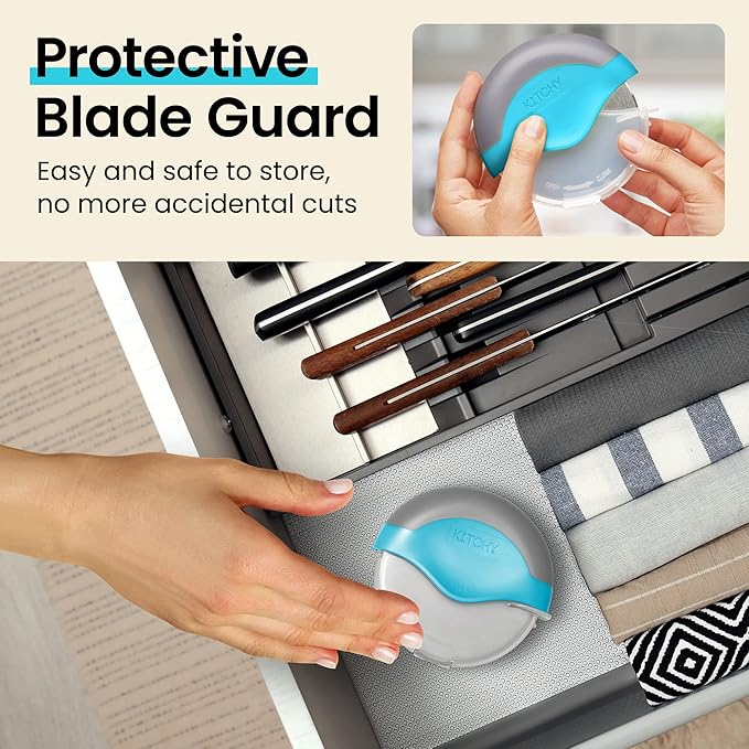 - PROTECTIVE BLADE GUARD FOR EASY STORAGE – This pizza cutter wheel comes with a blade guard to keep your cutter securely stored away when you’re not using it.