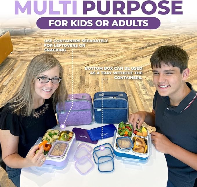 kinsho Stainless Steel Bento Lunch Box Set for Adults, Kids - Insulated Bag and Ice Pack - Leak-Proof Metal Compartment Meal Prep Food & Snack Containers for Work Travel School Daycare, 36 oz Purple