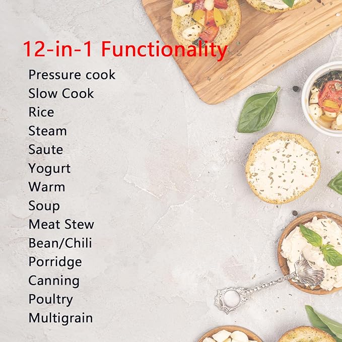 - [QUICK ONE-TOUCH COOKING]: 14 customizable smart programs take the guess work out of your cooking, achieve your desired results every time and prepare dishes up to 70% faster. These programs include: soup, meat/stew, beans/chili, poultry, rice, multigrain, porridge, yogurt, canning, steam, slow cook, sauté, keep warm and DIY. Complete functions can bring you the joy of cooking.