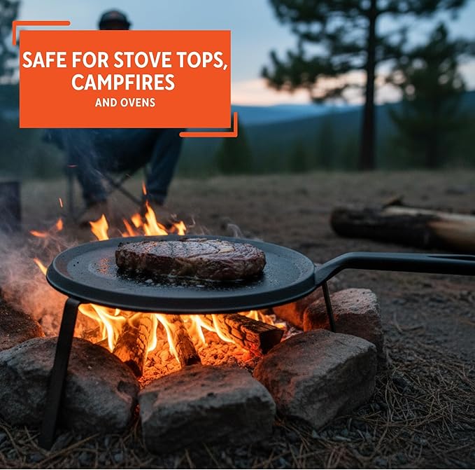 - VERSATILE FOR MULTIPLE HEAT SOURCES, Designed for stovetop, oven, and campfire use, durable flat griddle distributes heat evenly for reliable cooking performance from breakfast dishes to dinner favorites