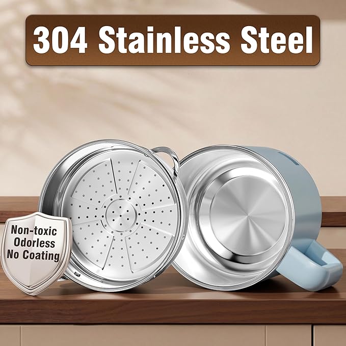 - 【304 Stainless Steel Steamer】 This electric pot is equipped with a 304 food-grade stainless steel inner pot and steamer. This high-quality material is not only rust-resistant and corrosion-resistant, but also non-toxic and odorless, providing excellent thermal conductivity for cooking. The cooker with a steamer can satisfy steaming above and cooking below at the same time, enjoying dual delicious and nutritious food.