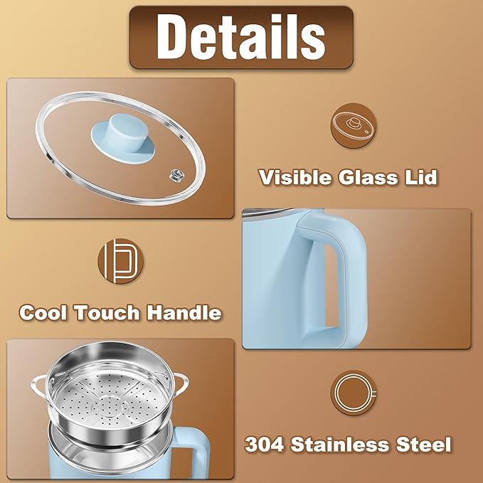 - 【Start Eating Healthy】 The interior of the pot is made of 304 food-grade stainless steel and the cover is made of thickening tempered glass, ensuring there’s no contamination to your food, caring for your health. The frosted exterior with the double-wall design can avoid slipping and you can be rest assured to hold it without being scalded.