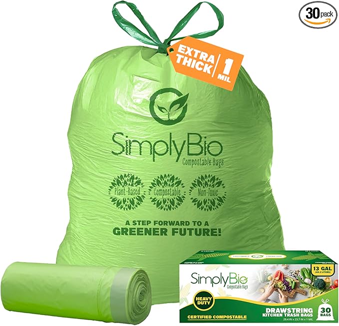Simply Bio 13 Gallon Compostable Trash Bags Liners Drawstring, Heavy Duty Extra Thick 1 Mil, 49.21 Liter, 30 Bags, Tall Kitchen Food Scrap Waste Bag, ASTM D6400, US BPI and OK Compost Home Certified