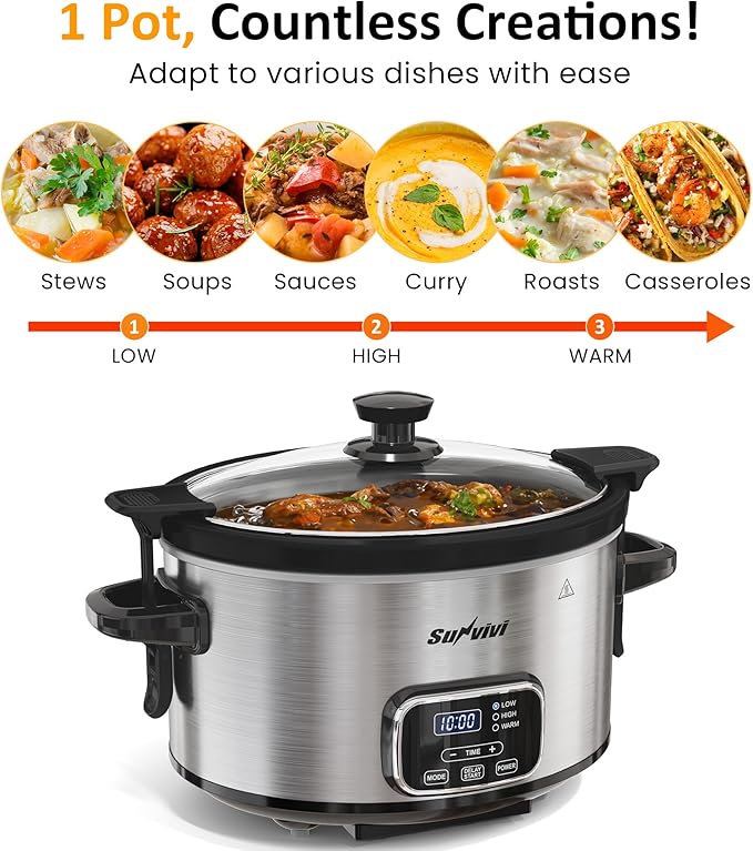 - One Pot, Limitless Options: Unlock endless culinary possibilities with this digital slow cooker. Whether you're whipping up flavorful dip sauces, gently heating dishes to perfection, keeping food warm for gatherings, or satisfying your daily cooking needs, this appliance is your ultimate kitchen companion.