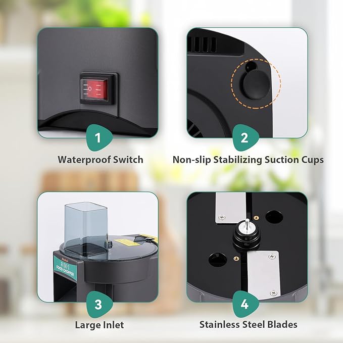 - 【Light yet Mighty】The body of this electric vegetable chopper is made of both lightweight and durable ABS plastic, and the machine weighs only 3.6kg, while being very stable in use thanks to the suction cups on the base.