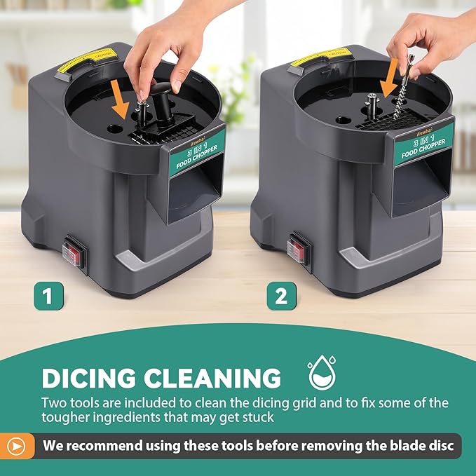 - 【More For Clean】This vegetable cutter machine comes with two cleaning tools for dicing grids that may be difficult to handle. In addition, the blade discs are all directly washable with water or machine washable, and the body can be easily wiped clean.