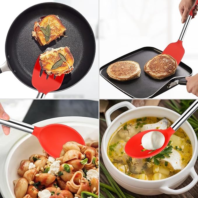 - Protects Non-Stick Cookware from Scratches – These silicone solid spatulas and spoons feature soft, non-abrasive silicone heads that prevent scratching and damaging non-stick surfaces. Whether you're stirring, flipping, or serving, these utensils are gentle on your pots and pans, ensuring your cookware stays in perfect condition.