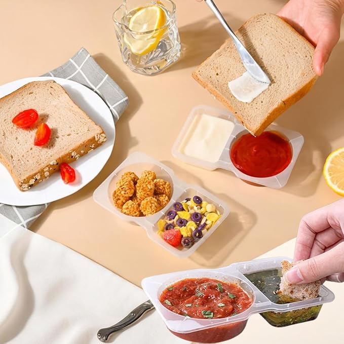- Versatile Dual-Compartment Design: suitable for storing various condiments and snacks. For example, salad, ketchup, nuts, office snacks, etc. Dual compartment design to prevent flavor mixing.