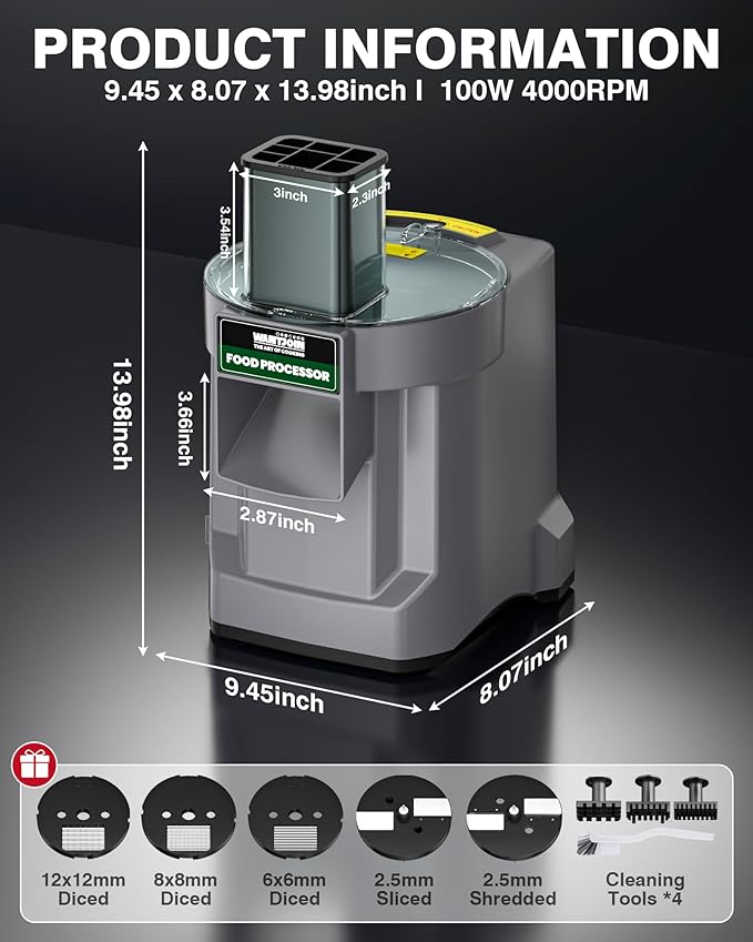 - WORRY-FREE SERVICE: Dimension: 8.3"*7.9"*13.8". Power: 100W. Voltage: 110-120V. Ideal for efficiently chopping, slicing, or dicing bulk volumes of root vegetables like potatoes and carrots to zucchinis, onions, and even citrus such as lemons. Includes electric dicer, white cleaning brush, 3 blade cleaners. We offer one-year coverage and professional one-on-one technical support. Please feel free reach out to us if you encounter any issues.