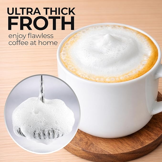 - POWERFUL FROTHING EXPERIENCE: Skip the coffee shop run and enjoy lattes, cappuccinos, matcha, hot chocolate, powdered drinks, or iced coffee at home with this milk frother. With a 8,000 RPM motor and spiral rings, this coffee foam maker turns ordinary milk to frothy perfection in seconds.