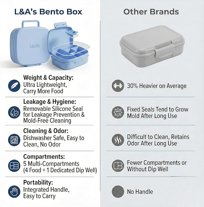 - PORTABLE FOR SCHOOL & WORK: Weighing less than 1 lbs, this slim bento box slides easily into backpacks, messenger bags, or gym bags. Ideal for kids, office lunches, or on-the-go travel.
