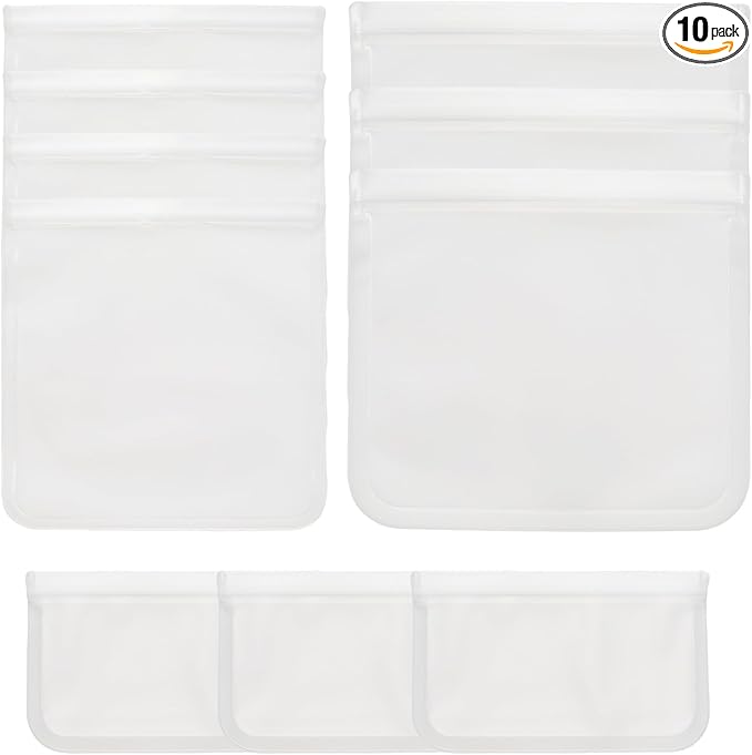 10 Pack Reusable Food Storage Bags, Leakproof Reusable Freezer Bags, 3 Sizes Silicone Food Storage Containers for Sandwich, Snack, Vegetable, Fruit or Meat (Clear)