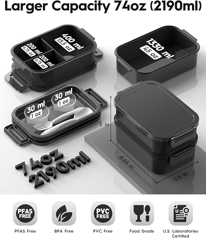 - 【Extra Large Capacity】Bento box boasts a capacity of up to 74oz (2190ml) and features 3 stackable leak-proof design. Lunch box 2:4:4 layout allows you to effortlessly organize main dishes, side dishes, desserts, or soups.