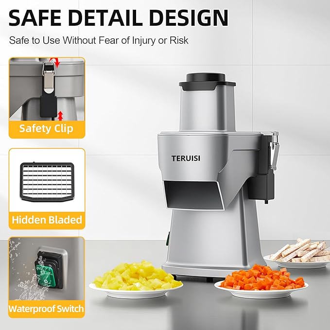 - 🥬SAFETY DESIGN - This Potato Slicer is equipped with stainless steel safety clips to ensure that the feed port is secured in place to avoid any risk of detachment. Designed with waterproof one-touch on/off switch, it is easy to use and ensures electrical safety at the same time. Non-slip suction feet on the base ensure stable operation of the machine.